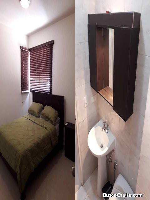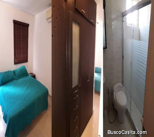Habitacion Ppal:AMPLIA CON CLOSET ENCHAPADO SE QUEDA EQUIPADA CON CAMA 2X2 Y SU COLCHON MAS 2 MESAS DE NOCHE, TELEVISOR Y AIRE ACONDICIONADO TIPO SPLIT DE 18000 BTU