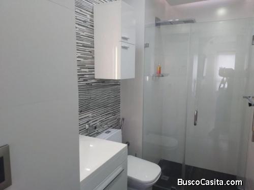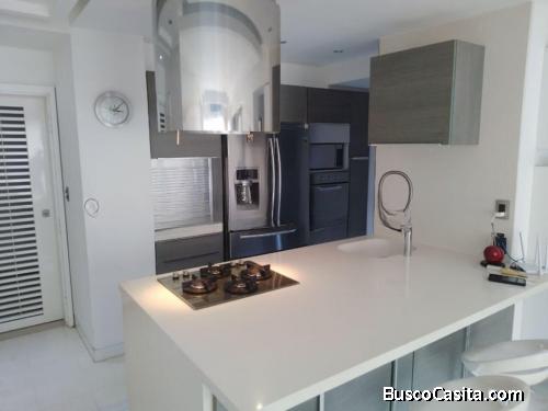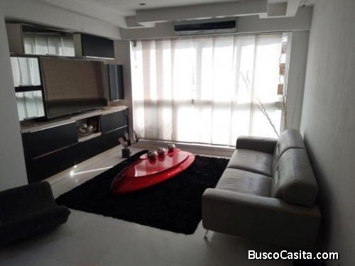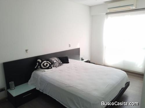 Hermoso, apartamento amoblado, impecable, totalmente actualizado, remodelado con exquisito gusto y con materiales de primera calidad, estilo minimalista, piso medio, 1 puesto de estacionamiento, mobiliario y equipos de vanguardia, con muy buena distribución con todas las comodidades, ventilado, bellas áreas comunes, accesos controlados con vigilancia y llave de contacto, zona muy exclusiva, 2 habitaciones, habitación principal con baño y vestier, en total 2 baños, 75Mts2, sala y comedor integrados, pisos de marmol, persianas electricas Hounster Douglas, bella cocina con tope de pared y meson en Silistone Blanco, lavaplatos automatico, lavadora y secadora, base para tv en silistone, puertas de vidrio en closets y vestier , calentador de agua, amplio maletero, totalmente enrejado, comercios cercanos, áreas sociales en excelente estado, salón de fiestas.