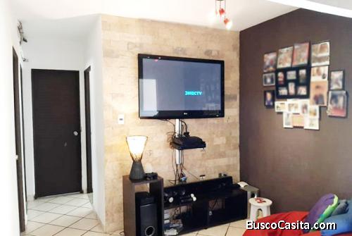 Este inmueble incluye pisos de cerámica, sala-comedor con dos sofás y un mueble para televisión, cocina moderna (deja: estufa, horno, campana y nevera) área de lavandería, tres habitaciones con closets y ventanas, dos baños y un puesto de estacionamiento.
