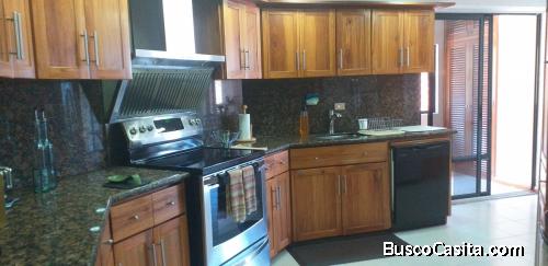 Amplia cocina equipada con tope de granito, gabinetes en madera y despensa independiente.