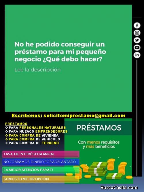 Atención: Escríbanos directamente a nuestro correo: solicitomiprestamogmail El anuncio ofrece un link para que nos contacte NO FUNCIONA, clientes nos han reportado que nos escriben y los mensajes no llegan. Si desea información y tener respuesta escribanos directamente al correo: solicitomiprestamogmail