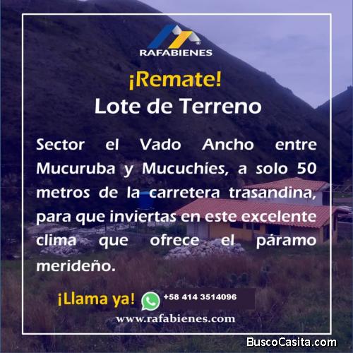 INMOBILIARIA RAFABIENES Vende lote de terreno ubicado en el sector Vado ancho entre Mucuruba, y Mucuchies, municipio Rangel Mérida, el cual cuenta con 238.52 mts2, a solo 50 metros de la carretera trasandina para que construyas la casa de tus sueños en este excelente clima que ofrece el páramo merideño. Quieres conocer más? Estamos a completa disposición de ayudarte a elegir lo mejor para tu familia. Contáctenos AL 0414 3514096 y encuentra tu próximo hogar con nosotros. (Precio sugerido por el propietario sujeto a cambio sin previo aviso).
