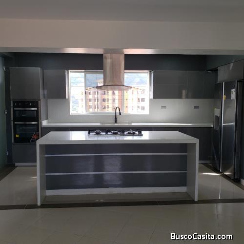 Cocina totalmente remodelada a estrenar, semiequipada, nevera, tope y campana, con hermoso granito y salpicadero, amplia sala comedor, tanque auxiliar de agua para el apartamento.