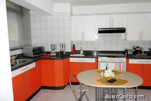 Este inmueble se encuentra completamente equipado con camas matrimoniales en hierro forjado con colchón ortopédico, baños equipados con puertas de vidrio templado y accesorios, aires acondicionados en 2 habitaciones y área sala comedor, televisor de plasma 42 pulgadas, juego de muebles de estar en piel sintética color chocolate, cocina empotrada con nevera, área de lavadero con lavadora y secadora, sistema interno hidroneumático marca pedrollo y calentador de agua.