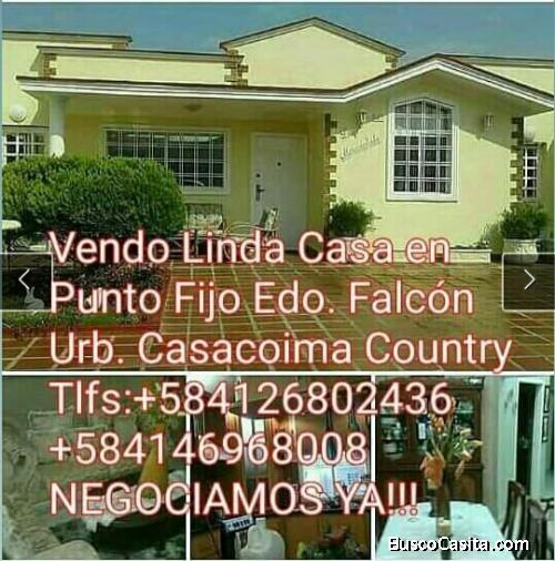 Urbanización Casacoima Country al lado de la Clínica de Especialidades, Av. 27 de Febrero. PUNTO FIJO EDO. FALCON. VENEZUELA, ????????La casa consta con 4 cuartos con closet de madera, 4 baños con sus puertas, sala, comedor, cocina empotrada con tope de granito, sala de estar, pisos de ceramica, TODA DE PLATABANDA con tanque subterráneo + 2 tanques aéreos, garaje para 2 o 3 vehículos. Tambien posee áreas comunes con bohio y 2 parrilleras, conjunto cerrado, vigilancia privada, cercado eléctrico completo, INFORMACIÓN A LOS TELÉFONOS