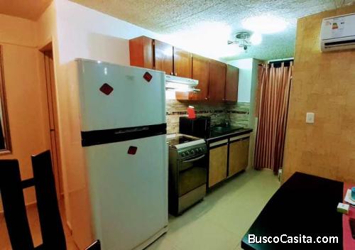 56 mtrs2, 2 Habitaciones, 1 Baño y 1 Puesto de estacionamiento. Habitaciones con clóset, Baño con pareduche de cristal templado, Cocina empotrada en mampostería, Protectores de seguridad y Piso de porcelanato. Se queda: Cocina, Campana, Nevera, Calentador, Tanque cilíndrico con sistema hidroneumático, 3 A/A tipo Split y Lámparas. El Conjunto cuenta con: Gas directo, Pozo, Áreas verdes, Conjunto cerrado. Listo para registro