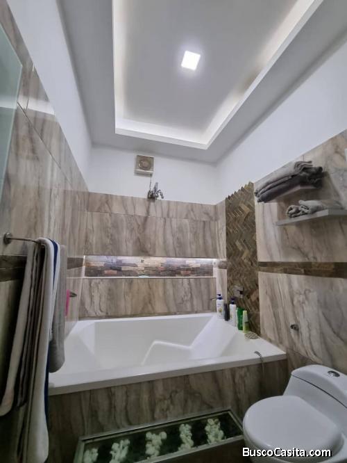 137 mtrs2 de terreno - Dos plantas, 3 habitaciones con closets, 4 Baños, 2 Puesto de estacionamiento techados y Pozo de agua. Terraza techada con parrillera, queda totalmente equipada, cocina concepto abierto tipo isla con tope de granito, techos decorados en escayola con luces Led, aires Acondicionados en todos los ambientes. FOC-1073