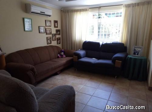 Semi-Amoblado, 180 mtrs2 de terreno y 115 mtrs2 de construcción distribuidos en 5 Habitaciones, 1 estudio, 3 1/2 baños y 4 Puestos de estacionamiento. En el inmueble queda: 5 Aires Acondicionados Split, calentador, lavadora/secador, cocina, campana, 3 camas individuales, 1 cama matrimonial (sin colchón), 1 cama Queen y juego de recibo. Techos de escayola en la parte de abajo, techo machimbrado en la parte de arriba, habitaciones con closets, principal con Vestier y tanque subterráneo de 7.000lt con hidroneumático.El Conjunto se encuentra en calle cerrada con portón eléctrico. FOTH-215